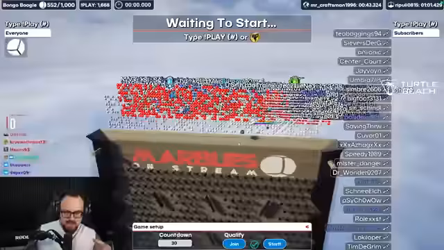 01:35:29Für den finalen Murmelwettbewerb kündigt der Streamer an, dass die ersten drei Plätze einen Sub erhalten, falls sie noch keinen haben. Zusätzlich verspricht er 50 Subs, falls ein VIP gewinnt, und 100 Subs für seinen eigenen Sieg. Er betont, dass der Wettbewerb kostenlos und von überall teilnehmbar ist, und startet eine neue Runde mit über 1000 Teilnehmern.