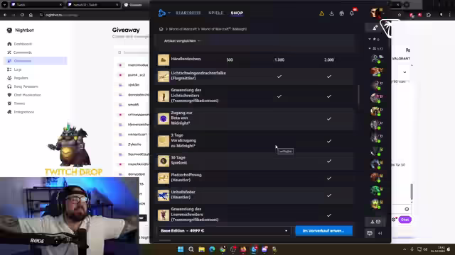 04:32:51Es wird überlegt, anstelle von zwei Midnight-Verlosungen eine normale und eine 100-Euro-Vorbesteller-Variante zu verlosen, die Game-Time, Mounts und Transmogs beinhaltet. Ein neuer Follower spendet direkt eine Midnight Epic Edition, was im Chat gefeiert wird. Die Verlosungen sollen gegen 13:00 bzw. 13:15 Uhr stattfinden, wobei alternativ zum WoW-Paket auch 100 Euro Battle.net Guthaben für andere Spiele wie Hearthstone oder COD möglich sind. Der Streamer bedankt sich bei Followern und Prime-Abonnenten und fordert auf, Prime Sounds im Chat zu aktivieren. Es folgt ein kurzer Exkurs über Musikwünsche und die Aktivierung der Zuschauer, um die Mittagszeit am Samstag aufmerksam zu bleiben. Es wird ein Dungeon gespielt, wobei der Schaden der Gruppe gelobt und ein Aufruf gestartet wird, bei einem Drop den Chat mit Katzen-Spam zu fluten.