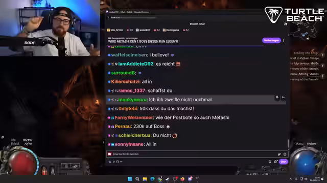 04:19:03Der Streamer findet endlich die benötigte Regal Orb und beginnt mit dem Aufrüstung seines Stabes. Er experimentiert mit verschiedenen Modifikationen und zeigt seine Begeisterung über die verbesserten Werte. Vorbereitet auf den Bosskampf stimmt er seine Ausrüstung und Fähigkeiten an, während er parallel die Kanalwette bewirbt.
