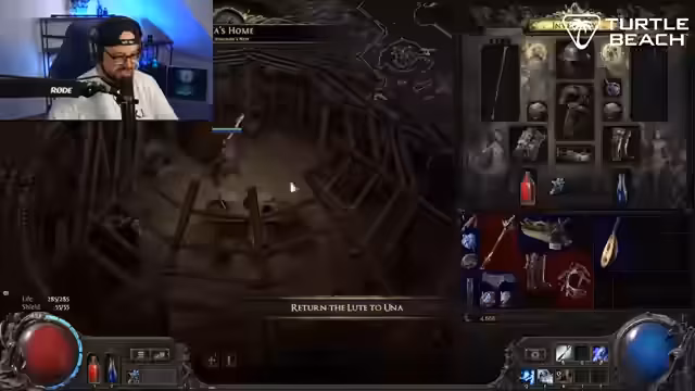 04:47:20Der Streamer steht vor einem besonders gefährlichen Gegner, der Lachlan, und muss einen Rauschtrank verwenden, um zu überleben. Trotzdem gelingt es ihm und seinem Team, den Boss zu besiegen. Nach dem Sieg werden die gesammelten Beute-Gegenstände analysiert und in den Inventarplatz gelegt. Ein besonders wertvoller Gegenstand ist eine Uncut Skill Jam. Der Streamer ist sichtlich erleichtert und zufrieden über den erfolgreichen Kampf.