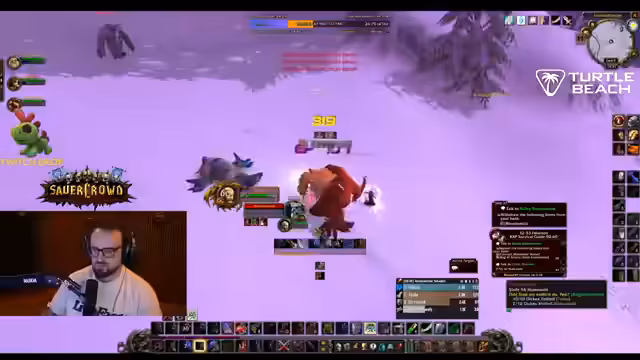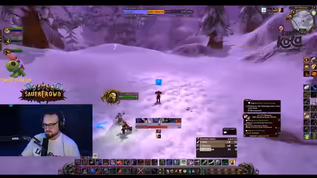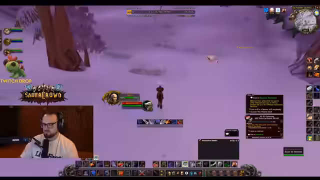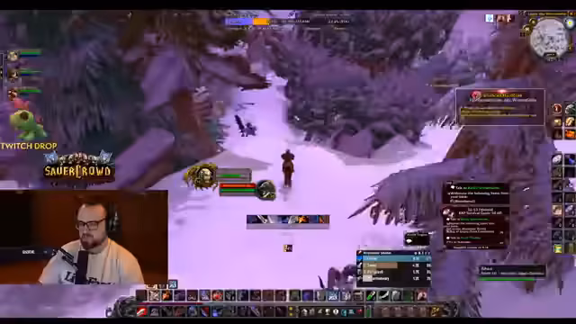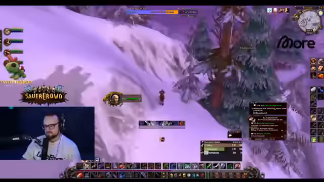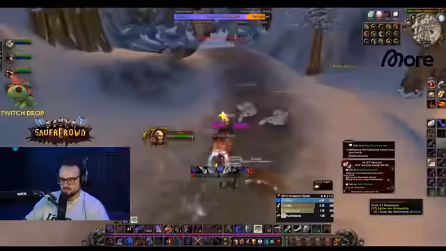 04:38:56Die Gruppe ist in Winterspring unterwegs und grindet Mobs, um Erfahrungspunkte zu sammeln und für Quests wie 'Bedrohung der Winterhügel' vorzubereiten. Es wird diskutiert, wie man die Quests am effizientesten lösen kann, wobei die 'Leadblume'-Buff den Schaden deutlich erhöht. Der Streamer ist bemüht, den Gruppenzusammenhalt zu wahren und gibt Anweisungen zum Sammeln von Federn und zum Töten von Elite-Gegnern.