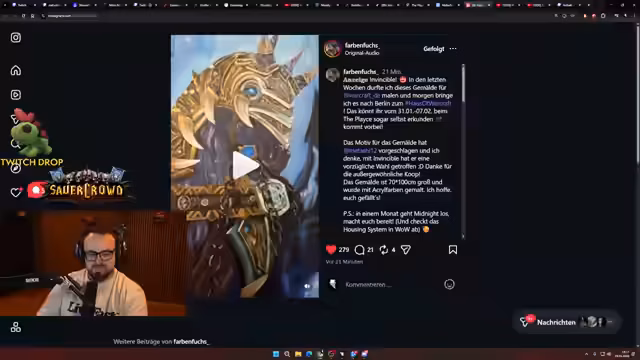 10:28:38Der Streamer erzählt die bewegende Geschichte hinter drei persönlichen WoW-Items, die für das Event in Berlin ausgewählt wurden. Dazu gehören der 'Zulianische Raptor', ein Erinnerungsstück an einen gemeinsamen Mount-Farm mit Bruder und Vater, und das Schwert 'Ravencrests Vermächtnis', eine Erinnerung an seine Zeit als Scarab Lord. Besonders emotional ist die Geschichte um den Mount 'Invincible', den er nach fast zehn Jahren und acht Charaktern endlich bekam. Zum Abschluss stellt er ein kürzlich fertiggestelltes Auftragsgemälde vor, das dieses Reittier zeigt und im WoW-Haus in Berlin ausgestellt sein wird.