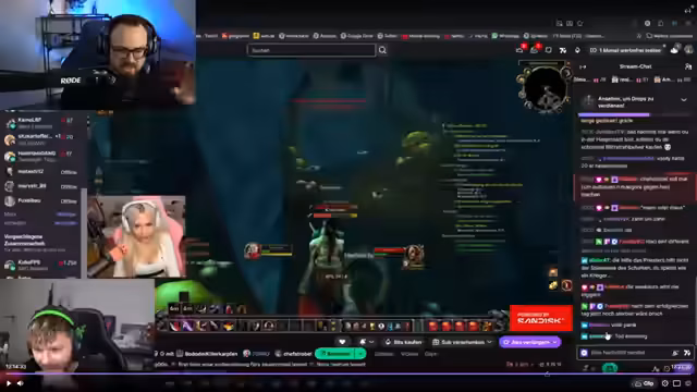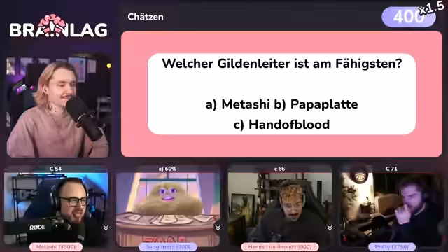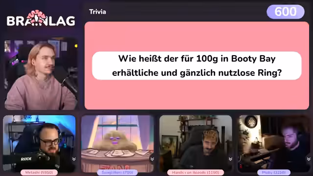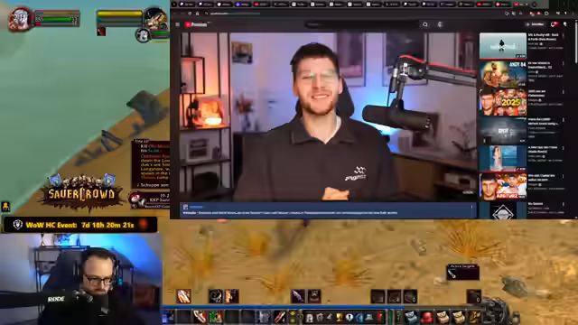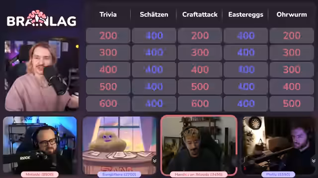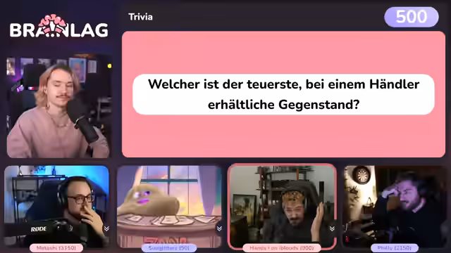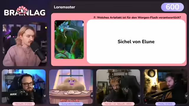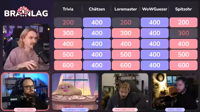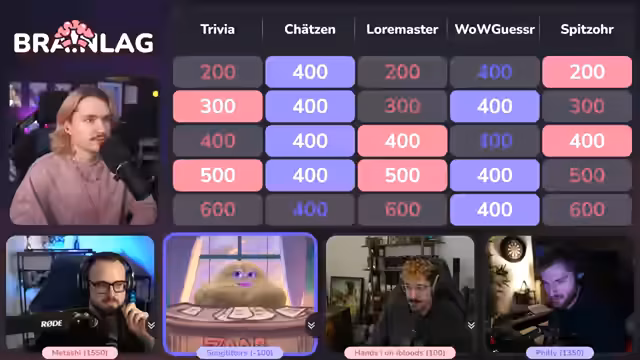 05:36:43Eine interaktive Chat-Frage ermittelt, wer beim Event am häufigsten sterben wird (Chef Strobel gewinnt die Vorhersage). Die Teilnehmer diskutieren Strategien für hochpunktige Spitzohr-Fragen, bei denen WoW-Sounds erkannt werden müssen. Technische Pannen mit Overlays und verzögerten Soundeffekten sorgen für Lacher. Gegen Ende wird die Dynamik zwischen den Teilnehmern durch schnelles Buzzing und wachsende Punktestände immer kompetitiver, bevor das Quiz fortgesetzt wird.