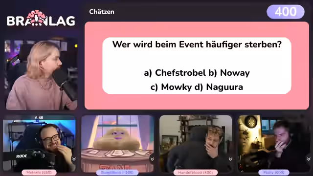05:36:43Die nächste Spielrunde ist eine Chat-Prediction. Der Streamer stellt eine Frage und die Twitch-Chatter aller Streamer können abstimmen. Die Teilnehmer müssen dann vorhersagen, wie der Chat abgestimmt hat. Die erste Frage lautet: Wer stirbt beim Event am häufigsten? Die Teilnehmer geben ihre Vorhersagen ab, indem sie eine Buchstaben- und Prozentangange im Textfeld eintragen. Es kommt zu Diskussionen über die korrekte Antwort und wie die Chatgewichtung zu interpretieren ist.