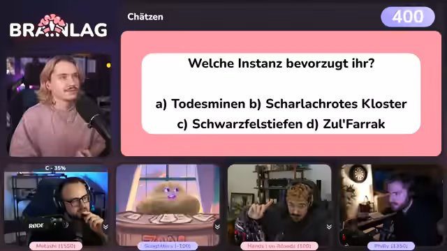 07:28:03Der Stream beginnt mit einem interaktiven Quizformat. Die Teilnehmer beantworten Fragen zur World of Warcraft, darunter ein Flaggenquiz zur Zuordnung von Fraktionen und ein Craft-Attack-Quiz, bei dem es um die Herstellung bestimmter Gegenstände aus Zutaten geht. Dabei werden auch Items wie Drachenfeuer-Chili und Skorpionfleisch thematisiert, die als Min-Max-Elemente im Spiel bekannt sind. Es folgt eine Schätzfrage zur Dauer der Fahrt mit der Tiefenbahn, die mit zwei Minuten und einer Sekunde beantwortet wird.