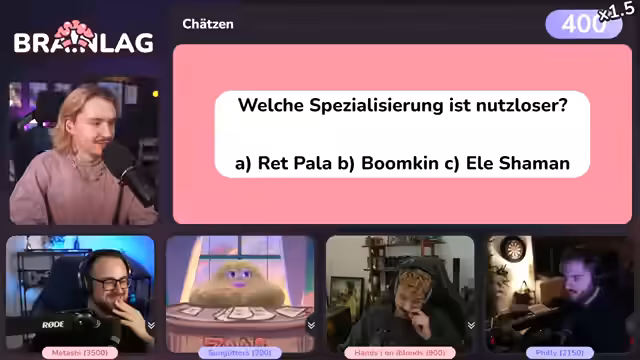 06:46:44Der Streamer stellt eine Frage zu Varian Wrynns Spaltung in der Arena, was zu einer hitzigen Debatte unter den Teilnehmern führt. Kurz darauf startet eine Umfrage im Chat, um herauszufinden, welche Spezialisierung – Red Paladin, Boomkin oder El Shaman – als am 'nutzlosesten' gilt. Die Ergebnisse sind knapp und offenbaren unterschiedliche Meinungen über den Nutzen der Klassen. Die Segment wird durch allgemeine Banter und persönliche Anspielungen aufgelockert.