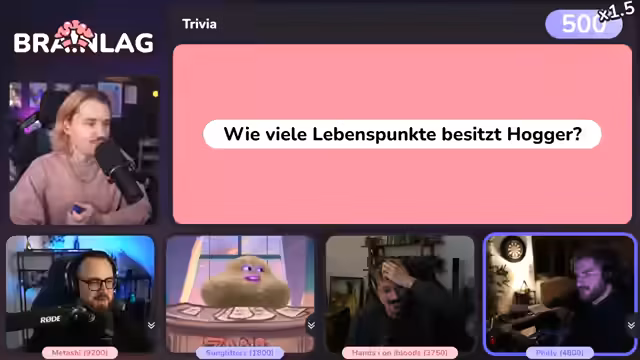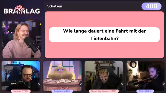 05:42:59Der Streamer präsentiert die Ergebnisse der Chat-Umfrage. Für Chef Strobel haben zwischen 48 und 97 Prozent der Chatter gestimmt, je nach Stream. Sun Glitters trifft die Vorhersage mit 60 Prozent am genauesten und gewinnt die Punkte. Die anderen Teilnehmer lagen daneben. Nach der Auswertung geht es mit weiteren Quizfragen weiter, diesmal mit Sound-Dateien. Bei einer Frage zu 'Unter Wasseratmung' für 600 Punkte gewinnt Philly, während Metashi sich unsicher ist und falsch liegt.