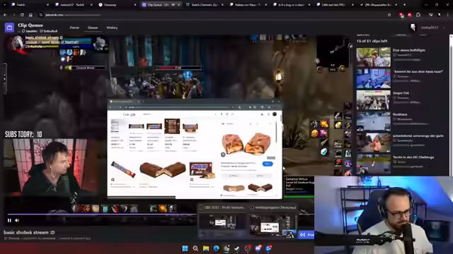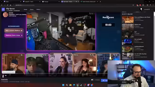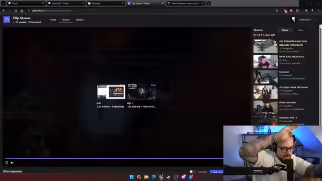 01:23:18Um den Content zu verbessern, wird ein neues System namens "Clip Queue" eingeführt. Zuschauer werden aufgerufen, in den nächsten fünf Minuten Clips in den Chat zu posten. Diese Clips werden dann gesammelt und der Streamer wird sie live ansehen. Es wird klargestellt, dass der Streamer Clips, die ihm unangenehm oder "cringe" sind, aus der Queue entfernen darf. Es gibt anfangs technische Schwierigkeiten bei der Umsetzung.