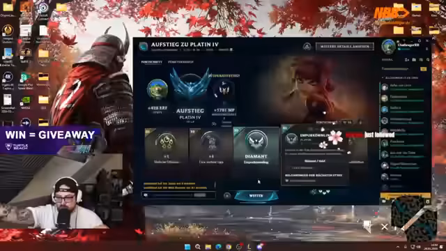 09:04:20Der Stream startet eine Aktion in Kooperation mit Turtle Beach. Für jeden gewonnenen Ranked Game in League of Legends wird eine Hardware wie ein Headset, Maus oder Tastatur im Wert von bis zu 300 Euro verlost. Die Teilnahme erfordert lediglich ein Follow auf dem Kanal und das Eingeben von "Ausrufezeichen Turtle Beach" im Chat. Der Streamer bittet die Zuschauer wiederholt, fleißig Ausrufezeichen zu posten, da der Bot aufgrund der hohen Teilnehmerzahlen überlastet ist und die Eingaben zählt.
