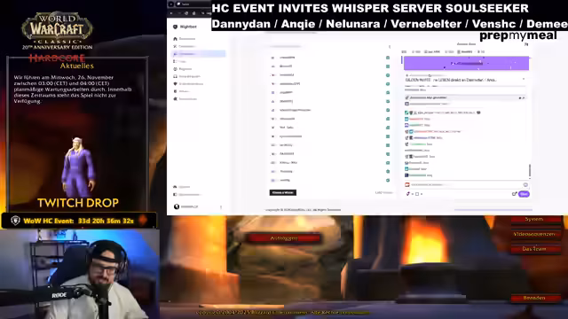 05:32:09Der Streamer informiert über den aktuellen Stand des World of Warcraft Hardcore Events (WoWHC). Es gab bereits 272 Zusagen von Streamern, was zu einem Überangebot führt. Es wird geschätzt, dass 350 bis 400 Streamer starten könnten. Das Event wird auf dem Server Soulseeker durchgeführt, und die Gilde ist für neue Spieler unter Level 20 geöffnet. Der Streamer erwähnt auch, dass es bereits eine Warteliste von Spielern gibt, die als Backup dienen sollen.