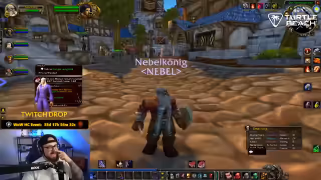 06:01:53Nach der emotionalen Gildenversammlung in Goldhain wird die Verteilung der Gildenwappenröcke zu einem zentralen Ereignis. Der Streamer hat Danny Dan 150 Gold auf dem Hardcore-Server gegeben, um Wappenröcke für die Gilde zu kaufen, wobei jeder Wappenrock etwa ein Gold kostet. Die Community bildet eine lange Schlange, die sich bis zum Käseverkäufer erstreckt, um einen der begehrten Wappenröcke zu erhalten. Der Streamer ist amüsiert über die „deutsche Pünktlichkeit“ und die Disziplin beim Anstehen, muss sich aber selbst hinten anstellen, obwohl er der Gildenmeister ist. Er beschreibt die Szene mit Humor und beobachtet, wie die Mitglieder ihre Wappenröcke stolz anlegen. Die Aktion zeigt den starken Zusammenhalt und die Begeisterung der Gilde, die sich durch solche gemeinsamen Erlebnisse weiter festigt. Auch ein Giveaway wird beworben, bei dem Hardware von Turtle Beach verlost wird, um die Community weiter zu engagieren.