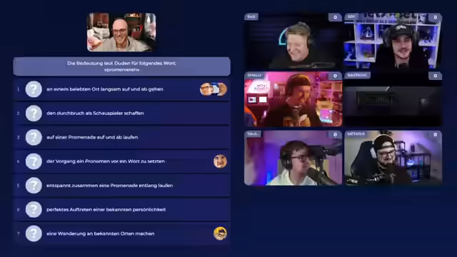 04:18:36Nach technischen Schwierigkeiten startet das Loxicon-Quiz. Das Spielprinzip wird erklärt: Es gibt mehrere Runden mit unterschiedlichen Aufgaben, die Teilnehmer haben 45 Sekunden Zeit, eine Antwort einzutippen. Alle Antworten werden anonymisiert aufgedeckt, und die Teilnehmer müssen sich für eine entscheiden. Die erste Runde besteht darin, die Bedeutung des Wortes 'Promenieren' laut Duden zu erraten, wobei viele Teilnehmer offensichtlich Schreibfehler machen.