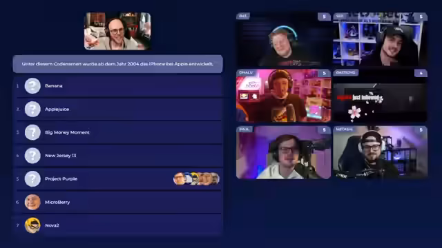 05:09:50Die Teilnehmer müssen den internen Codenamen des iPhone erraten, der bei Apple ab 2004 verwendet wurde. Zur Auswahl stehen Vorschläge wie "Banana", "Applejuice", "Big-Money-Moment" oder "Project Purple". Nach einer taktischen Überlegung, bei der Bram vermeiden möchte, dass jemand seine Absicht durchsieht, entscheiden sich mehrere Teilnehmer für "Project Purple", da dieser Name am sinnigsten klingt und bekannt ist. Bram bestätigt, dass seine Wahl von seiner Intuition kam.