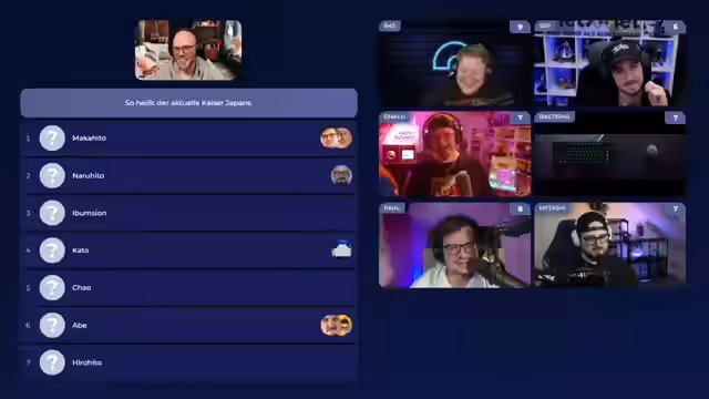 05:35:26In der allerletzten Runde müssen die Teilnehmer den aktuellen Kaiser Japans nennen. Die Vorschläge reichen von "Makahito" über "Naruhito" bis hin zu "Hirohito". Nach einigen wilden Spekulationen und Verwirrung um verwandte Personen wie Ex-Premierminister Abe, wird die korrekte Antwort "Naruhito" als Vorschlag zwei aufgedeckt. Bram hat den richtigen Vorschlag eingereicht und damit das Spiel gewonnen, trotz einiger Zweifel und taktischer Manöver der anderen Teilnehmer.