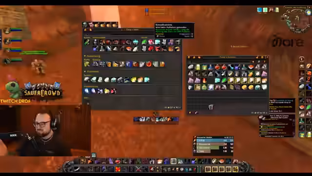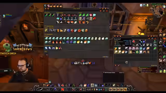 00:35:08Ein praktisches Problem wird offenbart: das Inventar der Gildebank ist komplett voll. Der Streamer muss Platz für neue Ressourcen schaffen, die für die Raidvorbereitung benötigt werden. Es wird eine Aufräumaktion gestartet und die Notwendigkeit zusätzlicher Banktaschen besprochen, um alle Gegenstände sicher aufbewahren zu können.