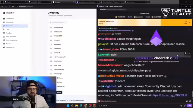 03:29:33Der Streamer erinnert die Zuschauer an das laufende Giveaway, bei dem ein 50-Euro-Gutschein verlost wird. Die Ziehung findet in 26 Minuten statt, zeitgleich mit dem Start von Craft Attack. Er erklärt erneut die Teilnahmebedingungen: "!50" eingeben und dem Kanal folgen. Währenddessen schaut er sich humorvolle Clips an, die von Zuschauern eingereicht wurden, darunter Videos über "Muschikraftbier" und skurrile Essensbeschreibungen. Die Stimmung ist ausgelassen und der Streamer bereitet sich auf den bevorstehenden Start von Craft Attack vor, indem er sich einen neuen Minecraft-Skin von einem Zuschauer einrichten lässt. Er ist gespannt auf das Event und die Interaktion mit anderen Minecraft-Spielern.