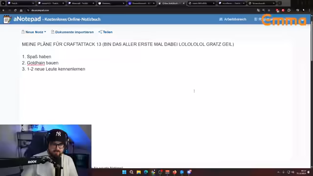 00:58:32Der Streamer öffnet einen Notizblock, um seine Pläne für Craft Attack 13 festzuhalten, wobei er betont, dass es sein allererstes Mal bei diesem Event ist. Die oberste Priorität und Regel ist es, Spaß zu haben und keinen Krampf-Content zu erzwingen. Er möchte nicht, dass sein Haus beschädigt wird, da er neu in Minecraft ist und diese Regel auch im Safe Space des Craft Attack Discords hinterlegt hat. Sein konkretes Bauprojekt ist der Nachbau von Goldhain aus World of Warcraft. Er zeigt Bilder von Goldhain und diskutiert mit dem Chat über die Umsetzung, beginnend mit dem Fundament, den Wegen, Zäunen und Lampen. Er ist sich bewusst, dass er Materialien farmen muss, da er keine unbegrenzten Ressourcen hat. Er ist extrem motiviert und freut sich auf die Herausforderung, auch wenn er selbst zugibt, in Minecraft ein "Schwanz" zu sein, der weder gut bauen noch überleben kann.