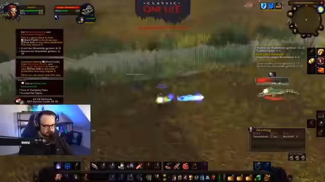 02:48:33Nach der Pause geht es zurück ins Gameplay. Der Streamer befindet sich auf Level 32 und führt Quests im Gebiet von Feralas durch. Er klagt über die notwendige Grinden, wie das Töten von 950 Nager, was er als "kranke Scheiße" bezeichnet. Es werden technische Fragen von Zuschauern beantwortet, wie z.B. der Einsatz von Bots, die erlaubt sind, sofern sie aus Deutschland stammen und nicht identisch mit denen des Streamers sind. Der Fokus liegt auf dem sicheren Grinden der anvisierten Level 60.