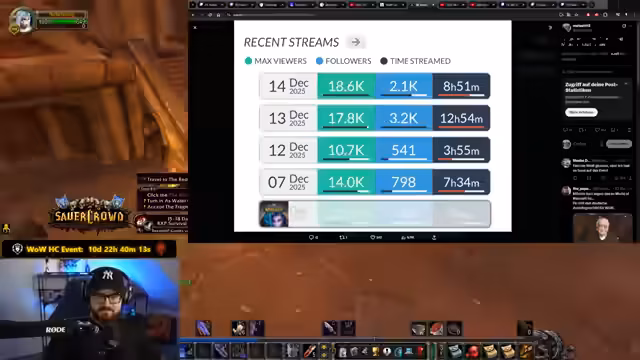 06:25:36Der Streamer kündigt ein monumentales Event an, das ab dem 27. Dezember für 16 Tage ununterbrochen nur World of Warcraft Hardcore gespielt wird. Der Stream wird im Schichtsystem zwischen ihm und drei Freunden laufen. Höhepunkt des Events sind Giveaways im Gesamtwert von über 20.000 Euro, darunter täglich verlose Hardware im Wert von 800 Euro. Der Streamer betont, dass dieses Event die bislang größte WoW-Veranstaltung der Welt sein wird und ruft die Community dazu auf, überall auf dem Laufenden zu bleiben.