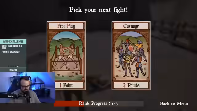 13:31:06Nach einem weiteren Sieg über einen Boss mit einer Heugabel erreicht der Streamer eine Stufe, in der er seine Waffe aufnehmen und eine riesige Axt verwenden kann. Er besiegt einen Boss durch Parieren und anschließenden Treffer und erreicht das nächste Level. Danach ist er sich unsicher über den Spielverlauf und den Aufstieg im Ranked-System, da ein Tod möglicherweise den Fortschritt zurücksetzt. Er beschreibt das Spiel als 'todesgeil' und 'lustig', trotz der brutalen Darstellungen.