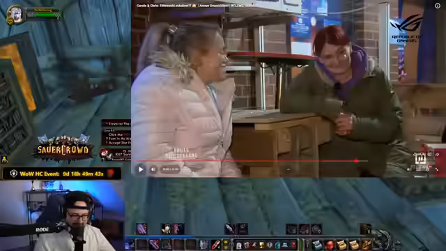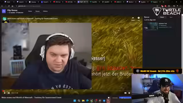 00:51:56Metashi12 kündigt Reactions auf WoW-Hardcore-Highlights an und öffnet eine Clip-Queue im Hintergrund. Zuschauer sollen lustige oder dramatische Clips aus dem Sauerkraut-Event in den Chat posten, die von Akia moderiert werden. Gleichzeitig äußert er persönliche Begeisterung für WoW und erwähnt, dass seine Frau genervt sei, da er wieder intensiv spiele.