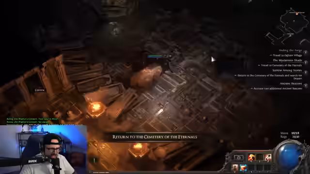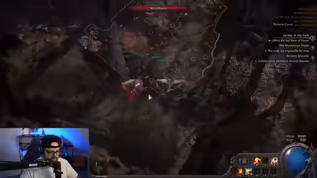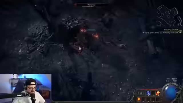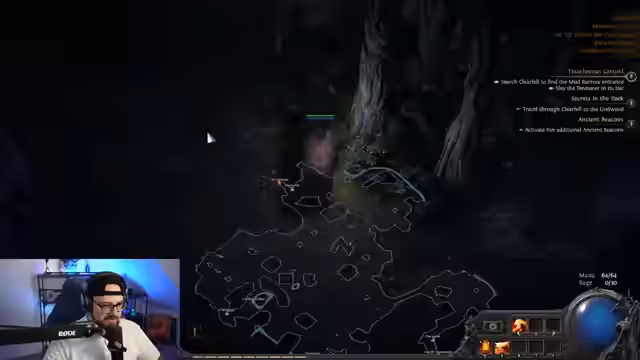 08:18:02Der Streamer arbeitet die Story-Quests in Grim Tangle voran und bereitet sich auf einen schweren Bosskampf vor. Er nutzt die Fähigkeit Shockwave Totem strategisch, um gegnerische Aggro zu verteilen, und betont mehrfach die Herausforderungen des Hardcore-Modus (permanent character death). Dabei diskutiert er Navigationsschwierigkeiten in den Dungeons und zeigt Verwunderung über die hohen Schadenswerte der Gegner.