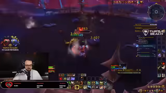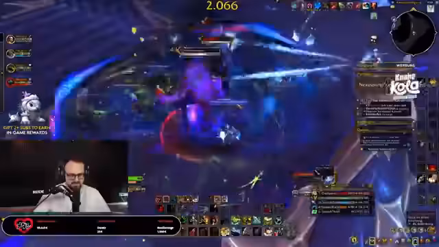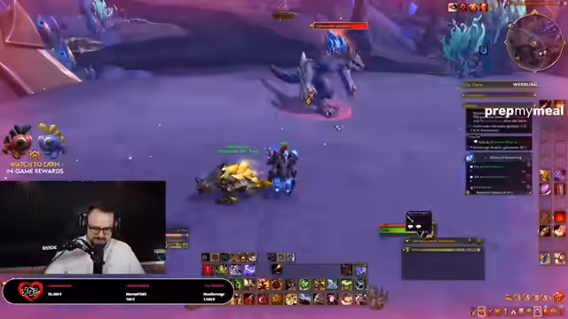 01:08:40Der Fokus verschiebt sich wieder hauptsächlich auf das Gameplay von *World of Warcraft: Midnight*. Der Streamer kämpft sich mit seiner Gruppe durch Dungeons, ist aber unzufrieden mit seiner Ausrüstung und dem DPS seiner Begleiter, insbesondere dem Pet 'El Shopo'. Er beschreibt den Kampf gegen Bosse wie Aleria Windläufer und Decimus als chaotisch und nervig, wobei er sich über die Mechaniken und die Leistungen der Mitspieler äußert. Er versucht vergeblich, einen Heiler für eine Dungeon-Gruppe zu finden, und ist offenbar frustriert über die mangelnde Effizienz der Gruppenfindung. Er wechselt kurz von der Survival- zur Marksmanspezialisierung, um mit einem neuen Bogen mehr Schaden zu machen, und betont seinen Spaß an der Spielmechanik.