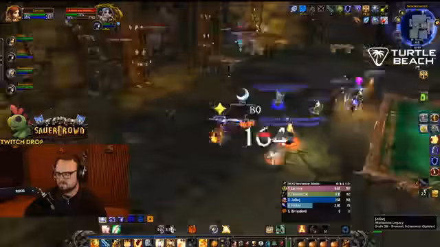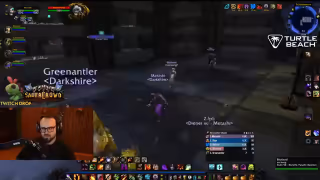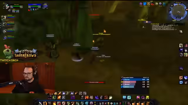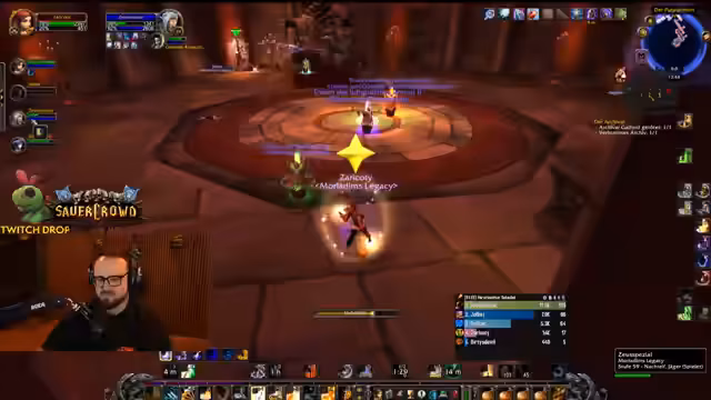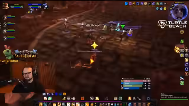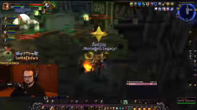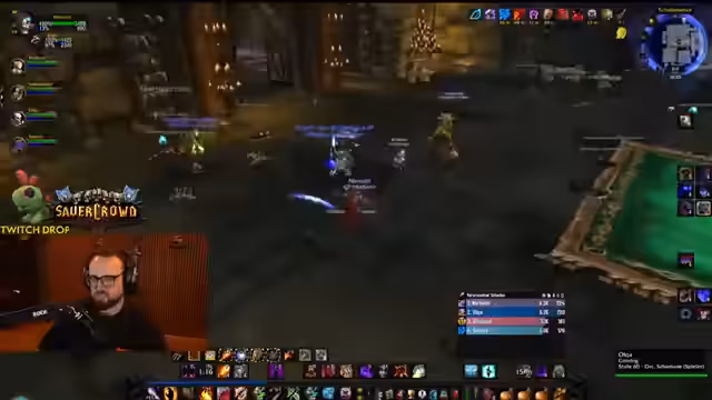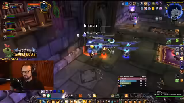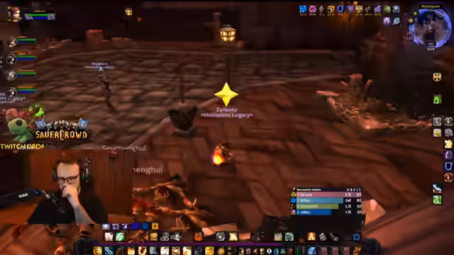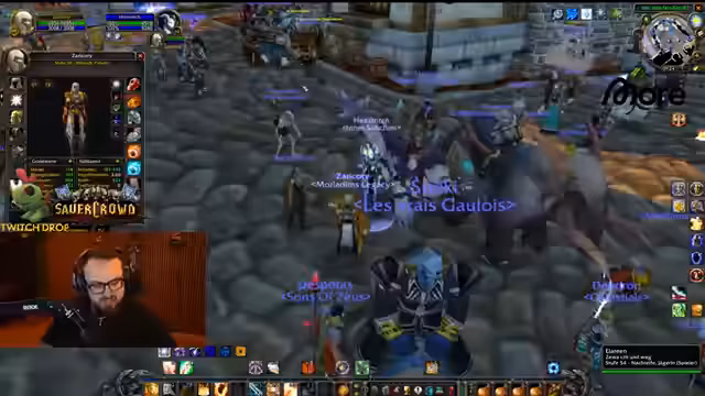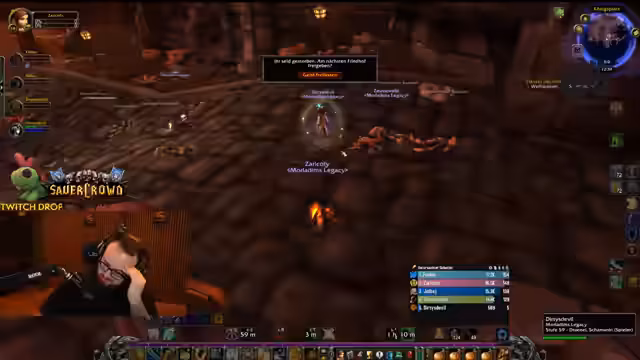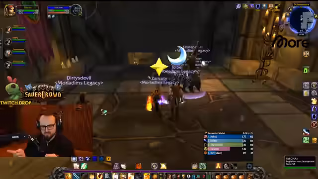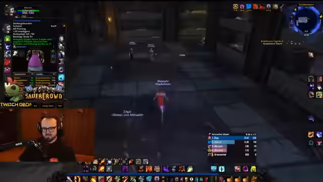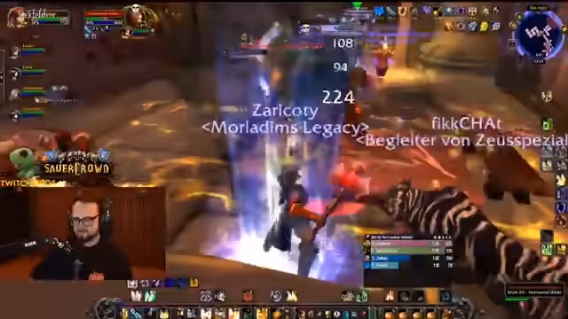 04:50:34Der Streamer befindet sich im Dungeon Stratholme und kämpft gegen diverse Gegner. Er interagiert stark mit den Zuschauern, wie Jolba und Zeus, und gibt laute Anweisungen. Es kommt zu mehreren Toden im Team, was zu humorvollen Reaktionen führt. Der Streamer erwähnt seinen Verlust der Rüstung und steht nur noch in Unterhose im Dungeon, was er selbst als FKK-Status bezeichnet und zur Belustigung der Chat-Community nutzt.