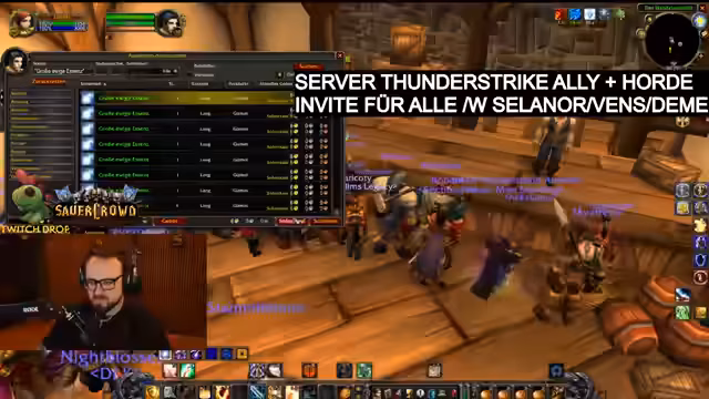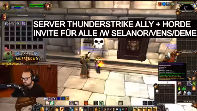 00:10:46Nach der Ankündigung geht es direkt ins Spiel. Der Streamer zeigt seine Vorbereitungen für seinen Paladin, einschließlich Umbenennung des Charakters und des Erwerbs eines Wappenrocks. Der Hauptfokus liegt auf der Erstellung einer Allianz-Gilde auf dem Server Thunderstrike. Er gibt klare Instruktionen, wie sich Interessierte in die Gilde einladen lassen können, indem sie sich an bestimmte Mitglieder wie Deme, Dicolo, Selanor oder Vance wenden. Er zeigt sich begeistert von den neuen Möglichkeiten wie dem Handeln mit anderen Spielern.
