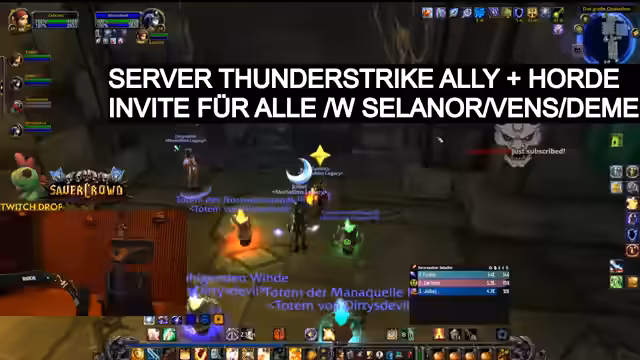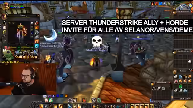 04:22:39Es wird der Wechsel des Servers von 'Classic' zu 'TPC' (The Burning Crusade) erwähnt. Die Gruppe spielt nun auf dem Server 'Thunderstrike'. Der Streamer kündigt für die Zeit des Wechsels ein Giveaway von 'REST XP Codes' für seine Follower an. Die Gruppe hält weiter an ihrer Kampagne fest und sucht nun nach neuen Quests in 'Stradliving'. Man lootet einen 'Kurier von Stratholm' und eine fröhliche, interaktive Atmosphäre kehrt zurück.