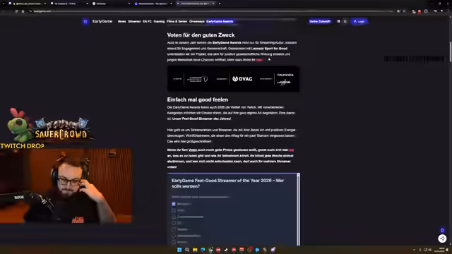 00:04:57Eine wichtige Ankündigung dominiert den Stream: Der Streamer ist für den Feelgood-Streamer des Jahres bei den Early Game Awards 2026 nominiert. Er listet die prominenten Konkurrenten auf und bittet seine Community eindringlich um Unterstützung, indem er einen Voting-Link teilt. Er betont, dass er die Community einen solchen Preis verdient und das Gewinnen des Awards besonders im Kontext seiner laufenden Charity-Aktion für krebskranke Kinder wäre. Er erklärt mehrmals den kurzen Vorgang, um abzustimmen.
