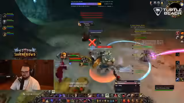 11:32:54Beim Versuch, die gesammelten Quest-Objekte abzugeben, treten erhebliche technische Probleme auf. Es wird eine lange Diskussion über die richtigen Addon-Einstellungen (Questie) geführt, um zu verhindern, dass die Quest automatisch angenommen wird. Ein Spieler namens Zeus verursacht durch seine Einstellungen eine Verzögerung, wodurch das gesamte Team Probleme bei der korrekten Quest-Übergabe hat und zeitlich hinterherhinkt.