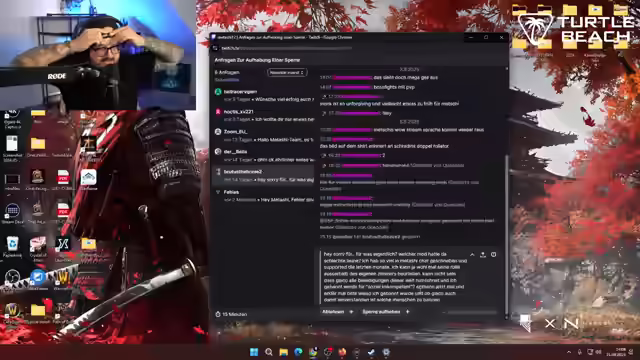05:15:57Es wird ein Hardware-Giveaway im Wert von bis zu 330 Euro unter allen Zuschauern im Chat verlost, die dem Kanal folgen und "!TB" in den Chat eingeben. Anschließend werden Entbannungsanträge bearbeitet, wobei der Streamer die Gründe für die jeweiligen Banns erläutert und die Community nach ihrer Meinung fragt. Dabei werden verschiedene Fälle diskutiert, von Beleidigungen über Eigenwerbung bis hin zu kritischen Äußerungen über gesponserte Spiele. Der Streamer betont, dass respektvolle Kritik willkommen ist, aber das Verbreiten schlechter Laune im Chat nicht toleriert wird. Einige Zuschauer erhalten eine zweite Chance, während andere weiterhin gebannt bleiben. Es wird ein Fall diskutiert, in dem ein Zuschauer rassistische Inhalte vermutet, was der Streamer jedoch verneint.