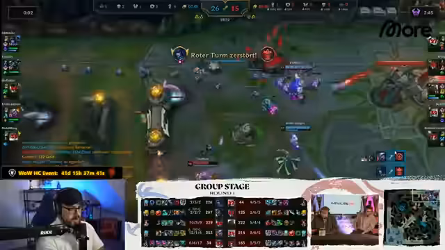 07:42:58Das Team startet in die fünfte Runde, motiviert durch die Möglichkeit, den ersten Platz zu erreichen. Eine frühe Auseinandersetzung führt zu einem Flash-Einsatz des Gegners, jedoch ohne First Blood für das eigene Team. Die Spieler passen ihre Strategie an und fokussieren sich auf Farm und das Sichern von Objectives wie dem Drachen. Trotz kleinerer Rückschläge, wie dem Verlust von Camps, bleibt die Moral hoch. Die Kommunikation über gegnerische Positionen und mögliche Ganks ist entscheidend, um Überraschungen zu vermeiden. Die Spieler versuchen, Mindgames zu spielen und den Gegner durch Emotes zu provozieren, um einen psychologischen Vorteil zu erzielen. Die Konzentration liegt darauf, die Lanes zu halten und sich auf spätere Teamfights vorzubereiten, während man auf die Power-Spikes der eigenen Champions wartet.