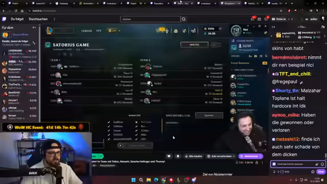 08:28:00Es wird eine kuriose Anekdote über einen Freund geteilt, dessen Bettwäsche nach einem Mardereinbruch entsorgt werden musste, was zu einer Diskussion über unhygienische Lebensweisen und den Kontrast zu Reichtum führt. Der Streamer vergleicht seine bescheidene Streaming-Ecke mit dem vermeintlichen Vermögen des Freundes. Anschließend wird die aktuelle Spielsituation im League of Legends Turnier erörtert, insbesondere die Wichtigkeit der kommenden Spiele für das Erreichen des Upper Brackets und die damit verbundenen Preisgelder. Es wird spekuliert, ob das Team die 20.000 Euro gewinnen kann, wobei die Chancen auf 20-25% geschätzt werden, während die 10.000 Euro im Lower Bracket mit 70% als wahrscheinlicher gelten. Die Spieler diskutieren die Risikobereitschaft und die optimale Strategie für die nächsten Matches.