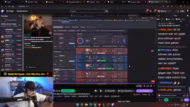09:41:11Es wird diskutiert, dass die Tiebreaker-Regelung auf der Game Time basiert, was bedeutet, dass das Team mit der langsamsten durchschnittlichen Spielzeit Dritter werden könnte. Ein Spieler schickt einen Clip, der die Stimmung aufhellt und die Freude über die Niederlage eines Gegners ausdrückt. Die Spieler reflektieren über ihre Leistung und die Tatsache, dass sie das erste Spiel unnötig verloren haben, was sie von einer besseren Platzierung abgehalten hat. Es wird humorvoll über die Lesegewohnheiten eines Spielers gesprochen und die Möglichkeit, ein Buch über den Lieblingsautor Tolkien zu lesen. Die Organisatoren des Turniers werden kontaktiert, um die genauen Tiebreaker-Regeln zu klären. Es wird bestätigt, dass kein Triple Tiebreaker gespielt wird, sondern dass die Game Time einen Sieger ermittelt und Platz 2 und 3 einen Best-of-One-Tiebreaker spielen. Die Spieler sind frustriert über die Situation, aber akzeptieren die Entscheidung. Es wird über die Vorteile und Nachteile des Lower Brackets gesprochen, wobei der Wunsch nach dem ersten Platz und dem damit verbundenen Preisgeld zum Ausdruck kommt. Die Diskussion über die Turnierorganisation eskaliert kurzzeitig, als ein Spieler die Organisation kritisiert und dafür einen Timeout erhält. Die Bedeutung von Respekt und Dankbarkeit gegenüber den Organisatoren wird betont, da die Planung eines solchen Turniers mit vielen Herausforderungen verbunden ist. Die Spieler reflektieren über die Teamchemie und die Fähigkeit, aus Fehlern zu lernen. Es wird über die Leistung anderer Teams und Spieler gesprochen, insbesondere über Strobel, der frustriert über seine Ergebnisse ist. Die Suche nach einem Ersatzspieler für Sascha, falls dieser nicht mehr spielen kann, wird fortgesetzt, wobei Yushi als potenzielle Option in Betracht gezogen wird. Es wird über die Qualität von Saschas Pyke-Performance diskutiert, die als sehr gut bewertet wird.
