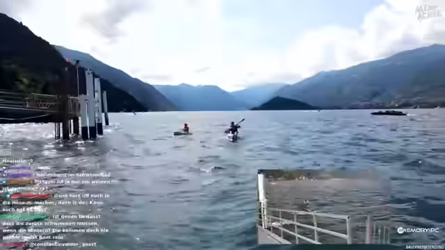 04:08:26Es wird überlegt, ob man eine Badehose hätte mitnehmen sollen, bevor eine Drohne gesichtet wird. Ein Rennen gegen die Drohne wird vorgeschlagen, wobei es Schwierigkeiten gibt, das Kayak zu drehen. Die Wellen werden als unangenehm empfunden, besonders in Ufernähe. Es wird ein Fisch im See entdeckt, was für Überraschung sorgt. Die Wellen treiben die Kayaks umher, und es wird über die Schönheit der Umgebung gesprochen. Eine kleine Insel wird als potenzielles Ziel für eine spätere Bootstour ins Auge gefasst. Es wird vor dem Wellengang gewarnt, der durch vorbeifahrende Boote entsteht. Ein Rennen wird vorgeschlagen, aber aufgrund der Instabilität der Kayaks verworfen. Stattdessen wird die Idee eines Rennens zu einer Drohne und zurück diskutiert, jedoch aufgrund von Sicherheitsbedenken bezüglich vorbeifahrender Boote verworfen. Ein erneuter Versuch, ein Rennen mit der Drohne zu starten, scheitert an der Kommunikation mit dem Team an Land. Schließlich wird ein Rennen gestartet, das jedoch aufgrund der Wellen und der Nähe zum Ufer als riskant eingestuft wird. Ein Boot verursacht hohe Wellen, die die Teilnehmer durchnässen.