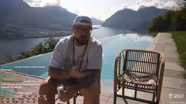 01:08:23Jan soll die Kamera so positionieren, dass er gefilmt wird, wie er in den Pool springt. Frederik soll sich eine Badehose holen. Es wird sich gefragt, wie die Gruppe an diesem Ort gelandet ist. Tobias wird nach seinem Befinden gefragt. Metashi möchte, dass Tobias mit der Drohne ins Pool fliegt. Es wird überlegt, wie Metashi auf die Begriffe kommt, die er verwendet. Es wird gefragt, wann die Targobank kommt. Es wird geplant, dass Metashi eine Arschbombe macht und Tobias mit der Drohne wegfliegt, sobald Metashi im Wasser ist. Es wird festgestellt, dass keine Sonnenmilch vorhanden ist und die Gruppe anfällig für Sonnenbrand ist. Es wird gefragt, ob jemand aus dem Chat Sonnenmilch am Komasee hat. Frederik möchte sich nicht ablichten lassen, da sein Körper besser aussieht als der von Metashi.