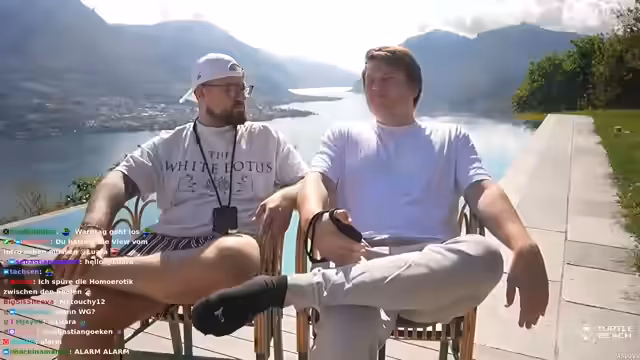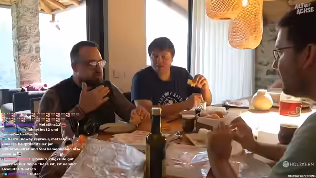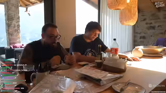 00:17:12Der Stream startet mit Betrachtungen über das gestrige Essen, das etwas zu üppig war, insbesondere die Vorspeisenplatte. Die Sonne scheint stark, und die Gruppe freut sich auf den Tag. Es wird über Akt 4 eines Spiels gesprochen, in dem der Protagonist verschiedene Inseln besuchen muss, wobei die richtige Reihenfolge unklar ist. Ein Zuschauer erwähnt den Koma-See, was zu Verwirrung führt, da es sich eigentlich um den Kokombasee handelt. Es wird festgestellt, dass Fredriks Socken absichtlich falsch herum getragen werden, als modisches Statement. Der Chat wird mit einem neuen Emote begrüßt, das eine bestimmte Geste von Metashi zeigt. Ein Dating-Format für Jan wird angekündigt, für das sich Interessenten bewerben können. Es wird erwähnt, dass Jan in der Fernsehsendung 'Mein Mann kann' im Finale stand und dort in High Heels Champagnergläser tragen musste. Der Tagesplan umfasst Schwimmen, Kajakfahren und eine Bootstour.