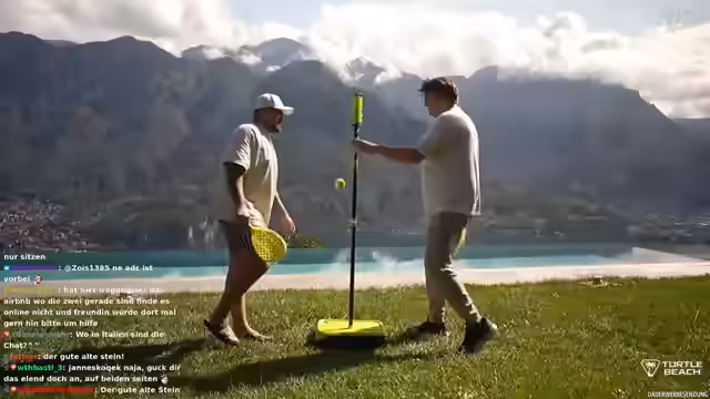 00:56:55Frederik gewinnt das Boccia-Spiel, und Metashi muss sich etwas anziehen, da er in der Sonne verbrennt. Jan soll sich nicht anziehen, da dies die Zuschauerzahlen senken würde. Es wird überlegt, Wasser in ein Gefäß zu füllen. Jan wird aufgefordert, sich auszuziehen. Es wird über Sport im Allgemeinen diskutiert. Metashi und Frederik spielen ein weiteres Spiel, bei dem es darum geht, ein Objekt mit einem Schläger zu treffen. Es wird über die Regeln und Taktiken des Spiels diskutiert. Frederik gewinnt auch dieses Spiel. Jan soll den Pool filmen, während Metashi und Frederik schwimmen gehen. Jan soll sich nackt zeigen. Es wird gefragt, ob es Essen gibt, aber das ist erst nach dem Schwimmen geplant. Es wird überprüft, ob die Internetverbindung noch besteht. Es wird überlegt, wie man einen fliegenden Wechsel beim Springen in den Pool macht, um die Kamera nicht zu gefährden.