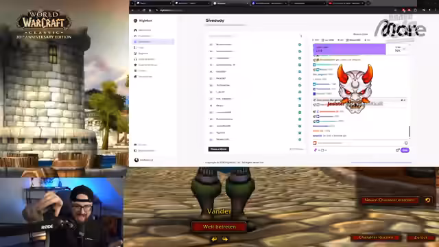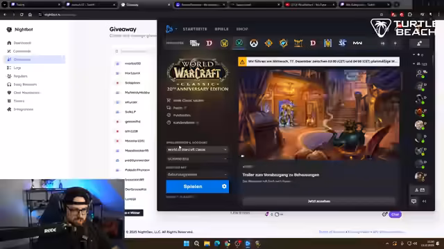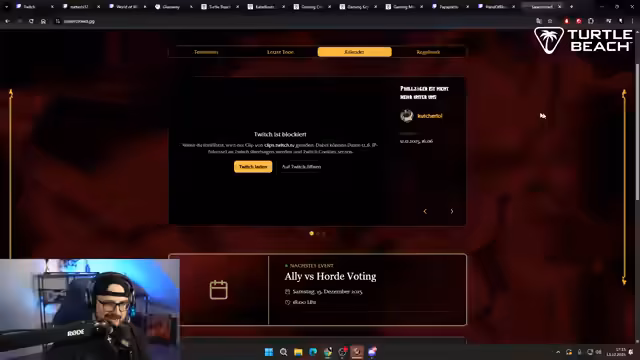 00:44:28Am 13.12.2025 um 8:45 Uhr startet der 12-stündige Stream mit einem chaotischen Morgen. Der Moderator kündigt ein volles Programm an: Reactions auf Game-Awards-2025-Videos, eine Carola-Doku und WoW-Videos. Geplant ist das Leveln auf Stufe 19, DMHC-Spielen, das Erstellen von Beginner-Guides für YouTube sowie Giveaways. Besonders betont wird die Fraktionswahl um 18 Uhr zwischen Horde und Allianz. Als Highlight ist ein Live-Konzert zum Thema WoW angekündigt. Der Streamer appelliert an die Community, Follows zu setzen, da allein heute Giveaways im Wert von über 900 Euro ausschließlich für Follower verlost werden – darunter zweimal Hardware von Turtle Beach im Wert von 400 Euro sowie 100 Euro Guthaben.