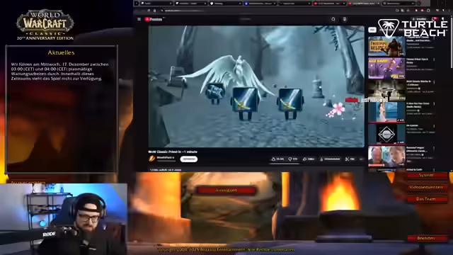 01:37:28Für den 13.12. kündigt Metashi12 ein großes Voting in Sturmwind an, bei dem zwischen Horde und Allianz entschieden wird. Er prognostiziert massive Überlastung der WoW-Server durch Tausende von Spielern – potenziell bis zu 12.000 – und bezeichnet einen Server-Crash als 'super gute Werbung'. Teilnehmer sollen Charaktere erstellen und für ihre Fraktion voten.