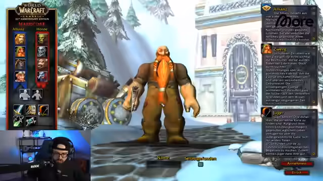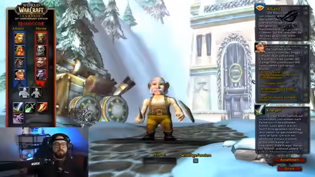 04:28:37Aufgrund vieler Anfragen von Streamern und Zuschauern startet der Streamer einen umfassenden Einsteiger-Guide für World of Warcraft Classic. Das Video soll sowohl für den Stream als auch für YouTube gedacht sein und soll helfen, sich für eine Fraktion, Rasse und Klasse zu entscheiden. Es wird eine detaillierte Anleitung zur Auswahl des richtigen Spiels im Battle.net Launcher gegeben, mit einem klaren Fokus auf "World of Warcraft Classic" und dem Hardcore-Server "Soulseeker".