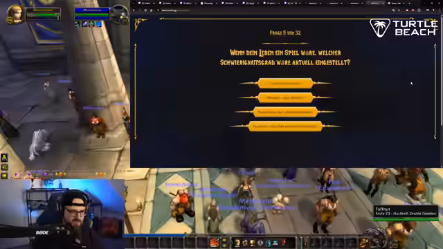 11:35:00Teilnehmer beginnen mit dem Quiz, das durch humorvolle und teils absurde Fragen führt. Beispiele sind Reflexionen über Stressreaktionen, Zeitmanagement, Lebensmotto und sogar abstrakte Bildinterpretationen. Die Ergebnisse fallen unterschiedlich aus: Einige landen bei Völkern wie Gnom, andere bei Menschen oder Zwergen. Die Reaktionen reichen von Begeisterung bis zu Theater-Frust, insbesondere wenn unerwünschte Ergebnisse wie Gnome auftauchen. Der Prozess wird als unterhaltsamer, community-weiter Akt dargestellt, der Einblicke in die Charakterpräferenzen der Teilnehmer gibt und die Vorbereitung auf den Event abrundet.