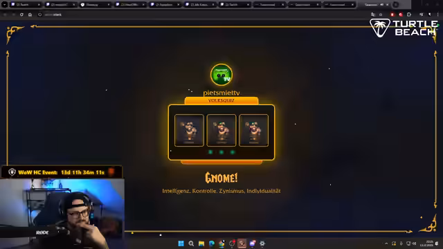11:44:58Der Stream beginnt mit einem Quiz, bei dem Streamer und Zuschauer Fragen beantworten, um ihren zukünftigen Charakter in einem World of Warcraft-Event zu bestimmen. Metashi äußert eine große Abneigung gegen die Rasse der Gnome und äußert Bedenken, bei einer solchen Zuweisung den Stream abzusagen. Währenddessen tauchen technische Probleme auf, da sich der Streamer und seine Kollegen nicht auf der quizrelevanten Seite befinden und zunächst nicht teilnehmen können, was zu Verwirrung und Frustration im Chat führt.