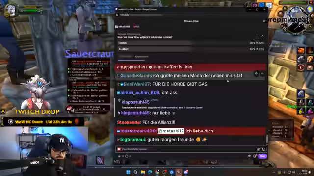 01:52:16Das Chat-Voting verläuft extrem knapp (51% Horde vs. 49% Allianz), bis Allianz am Ende mit vier Stimmen Vorsprung gewinnt. Metashi12 zeigt sich überrascht über die starke Allianz-Präsenz am Wochenende und akzeptiert das Ergebnis, woraufhin er eine symbolische Aktion für Allianz-Spieler durchführt.