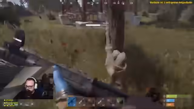 08:26:17Ein Mitglied der Gruppe hat immer noch Probleme mit Rust und muss das Spiel neu starten. Es wird vermutet, dass ein anderes Mitglied der Gruppe den Helikopter gestohlen hat. Die Gruppe diskutiert über Waffen und Munition. Ein Mitglied der Gruppe beschreibt, wie es seinen Penis kratzt, wenn es nichts zu tun hat. Ein anderes Mitglied der Gruppe kann dies aufgrund seiner körperlichen Einschränkungen nicht tun. Die Gruppe plant, zum Cargo-Ship zu fliegen, aber ein Mitglied hat kein Low-Grade. Ein Mitglied der Gruppe stürzt aus dem Helikopter.
