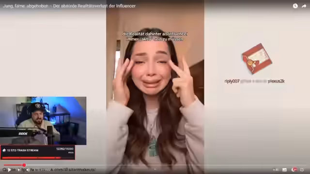 04:47:00Der Streamer spricht über den Druck, den Influencer erleben, wenn ihr Selbstwert durch Likes, Kommentare und Abonnentenzahlen definiert wird. Er erklärt, dass viele Influencer den Bezug zur Realität verlieren, weil ihr Erfolg nicht von Können oder harter Arbeit abhängt, sondern von der Relevanz. Gleichzeitig müssen sie sich ständig rechtfertigen, warum ihr Job schwierig ist, was zu einer Abhängigkeit von fremder Bestätigung führt.
