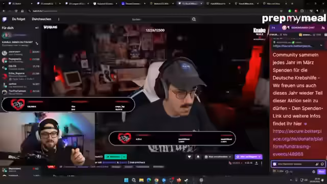 07:05:14Maximilian (Hand of Blood) wird im Stream begrüßt. Es wird kurz besprochen, ob Maximilian einen eigenen Spenden-Overlay bekommen soll oder ob er sich in die bestehende Spendenaktion integriert. Metashi12 erklärt, dass er seit Beginn seiner Streaming-Karriere Charity-Aktionen durchführt und dass die Community den "März mit Herz" ins Leben gerufen hat, um Spenden für krebskranke Kinder zu sammeln. Die Spenden werden in Zusammenarbeit mit der Deutschen Krebshilfe und Better Place gesammelt. Der aktuelle Spendenstand liegt bei 133.655 Euro, was den Gesamtspendenstand aller "März mit Herz"-Aktionen auf etwa 870.000 Euro erhöht. Ziel ist es, die Marke von einer Million Euro zu erreichen. Maximilian richtet währenddessen seinen Stream ein und es wird über das Spiel Dark and Darker gesprochen, das die beiden zusammen spielen werden.