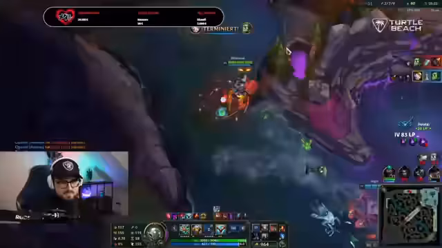 04:41:55Nach verpassten Opportunities in der Mitte und an der Bot-Lane verliert das Team den Druck auf den Nashor. Während das Team einen Baron-Nashor in Angriff nimmt, nutzt der Gegner die Chance, die gegnerische Basis zu stürmen. Das Spiel ist in einer katastrophalen Situation und der Streamer gibt nach 40 Minuten Spielzeit auf, was eine Rückstufung in die Gold-Liga bedeutet.